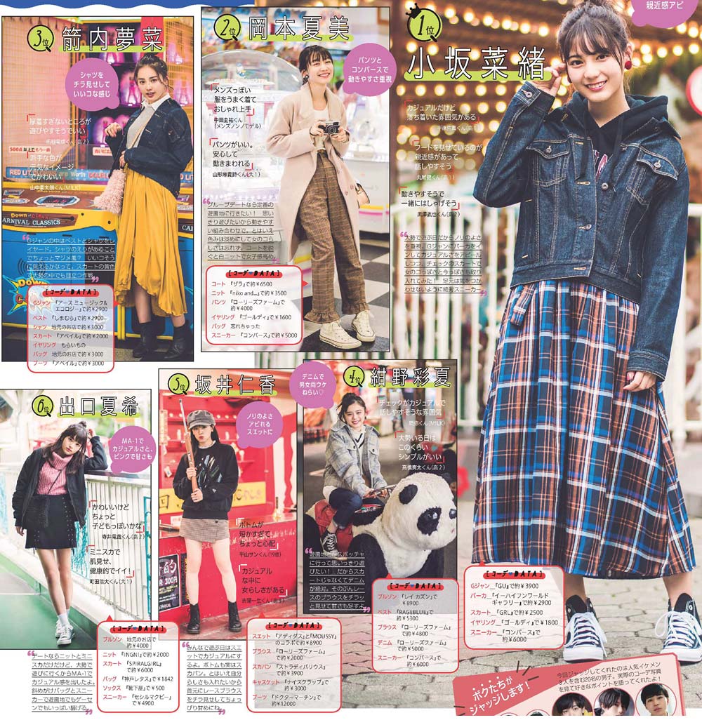 (上左)Gジャンの中はベストとシャツをレイヤード。シャツのえりがあることでちょっとマジメ風? いいコそうに見えるかなって。スカートの黄色で大勢の中でも目立つ作戦♪