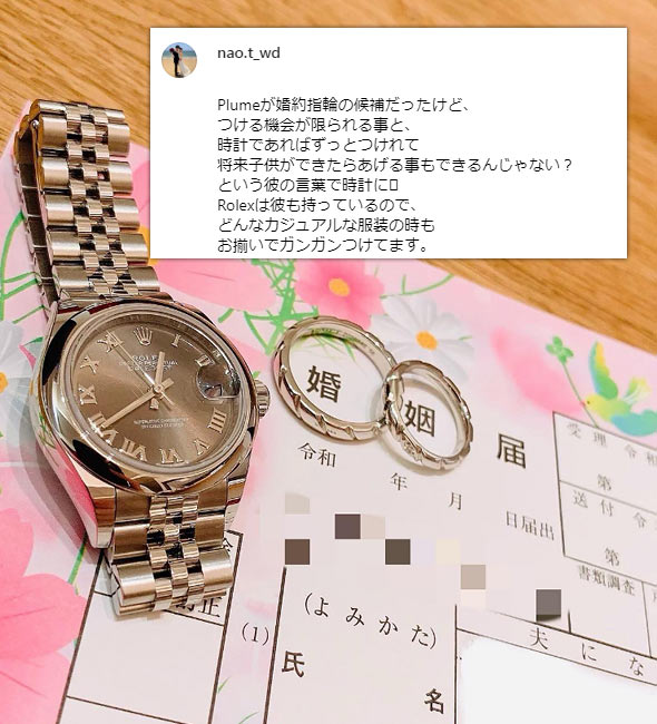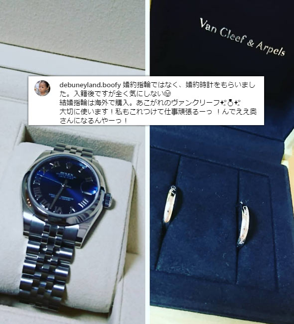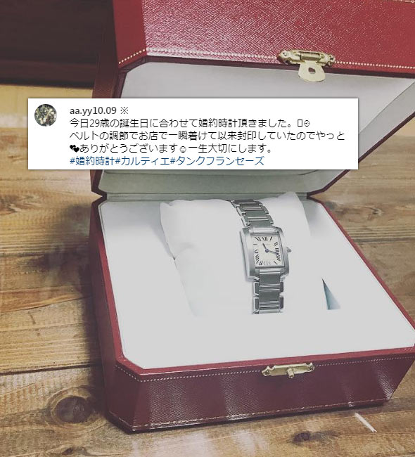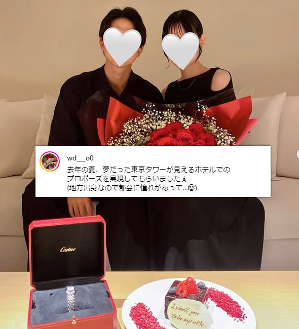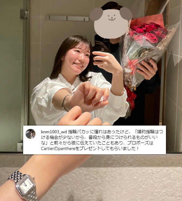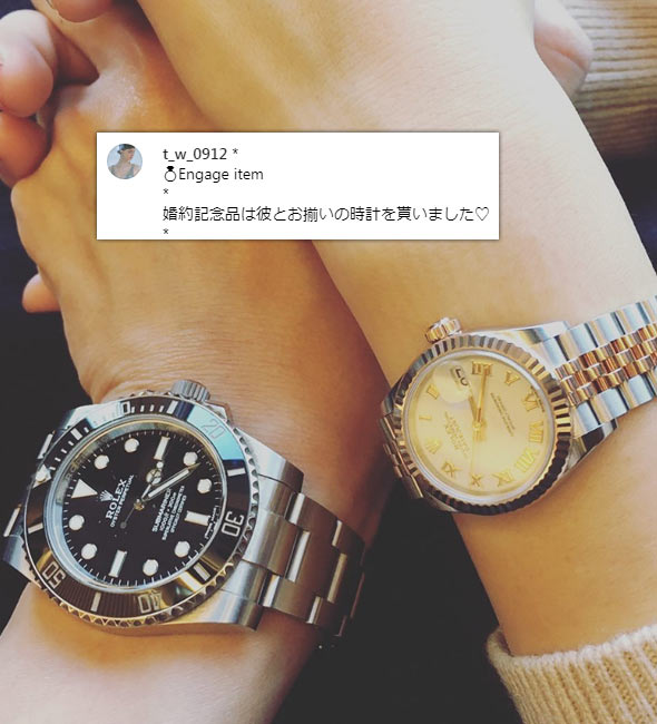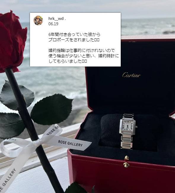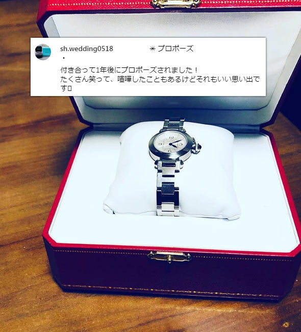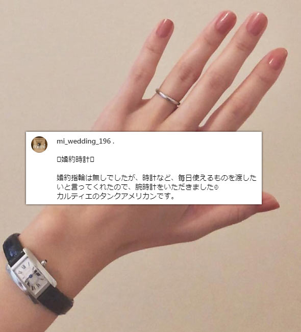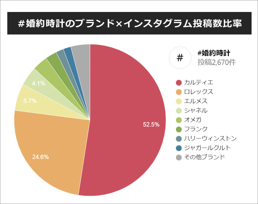 インスタグラムの「#婚約時計」2670投稿の中から、女性が婚約時計をプレゼントされた投稿、婚約時計を着用している投稿を集計し算出しました。