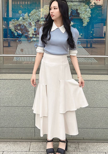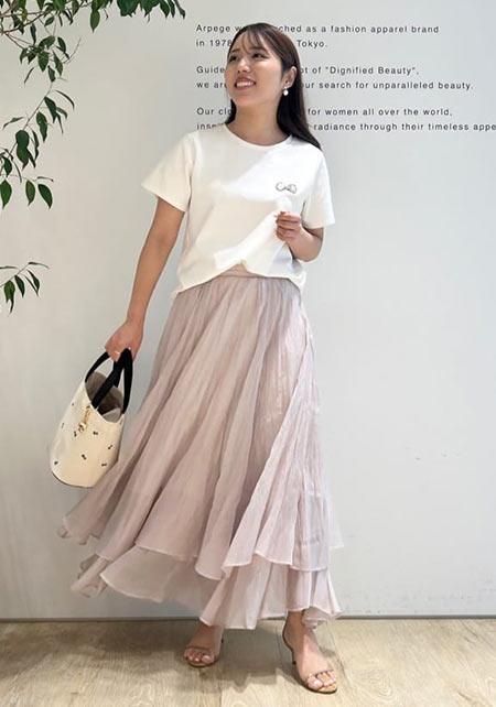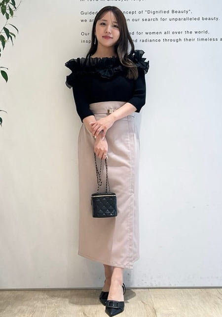 しっとりとした光沢のあるシャンタン素材のフリルスカート。トップス次第で甘めにも清楚にも対応してくれるエレガントな仕上がりです。バランスのいいタックが清潔感と高めます。
