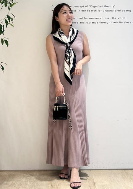 スッキリとしたタイトシルエットで「大人レディな美スタイル」に決まるワンピ。控えめなウエストリボンやリブ地が着こなしのポイントに。さらに相性抜群なY字ロングネックレスも付いています。