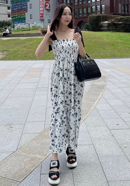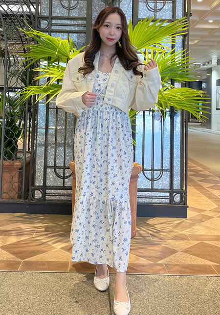 最近トレンドの「上下別々」に見えるセットアップ風ワンピ。Sweetな花柄は男性ウケ抜群♥ 小ぶりなバッグとパンプスを合わせればモテるデートコーデの完成です。