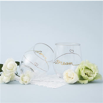 ゴールドでLOVEとDREAMがプリントされた結婚祝いに最適なペアグラス。