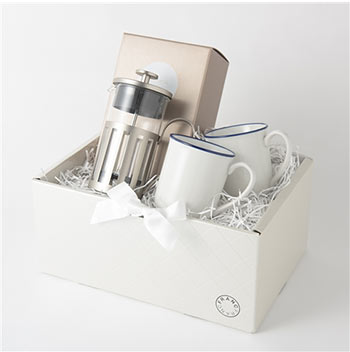 コーヒーが好きな方への結婚祝いぴったりな、本格的なフレンチプレスとマグカップのギフトセット。
