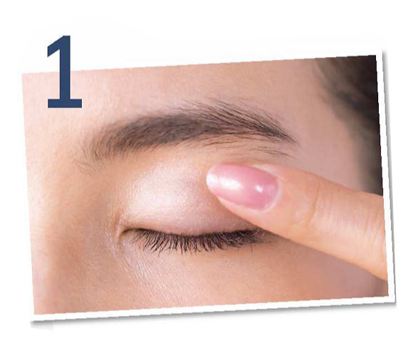 白っぽいクリームアイカラーを人さし指にとり、まぶたを軽くさするようにしながら眉下まで大胆に塗り広げて。濡れたようなツヤと光をプラスし、まぶたのくすみを払います。