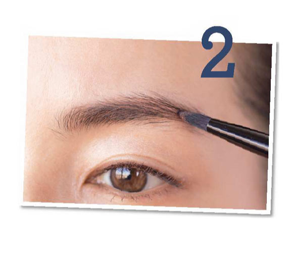 いつものように眉を描いたら、上から赤やオレンジ系のアイカラーを重ねます。地肌を染めるようにアイシャドウブラシで色をのせ、眉にふわっとした軽さを出しましょう。