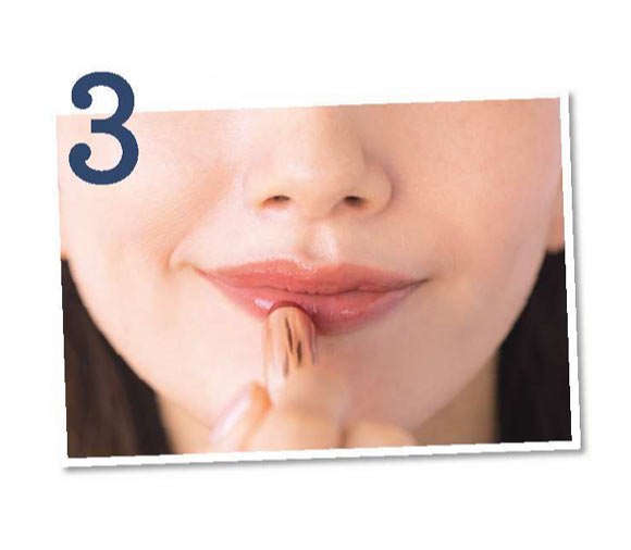 リップは唇に押し当て、小さな円を描きながらグリグリ塗り。ティントリップを使い、にっこり笑って唇のシワを伸ばして塗ると、落ちにくくなって、マスクの日でも安心です。
