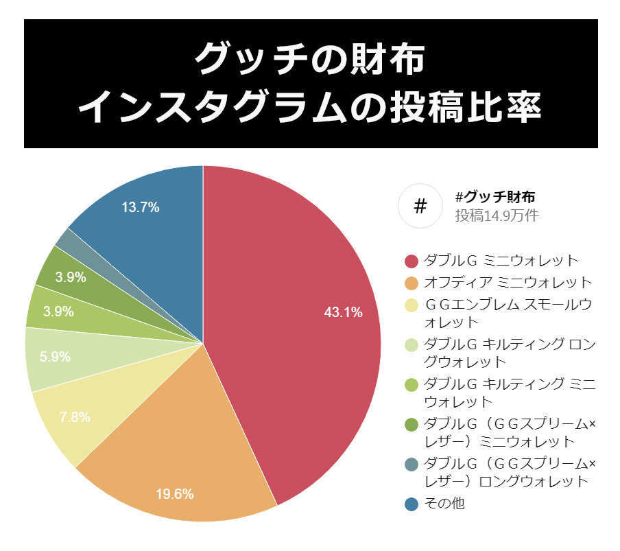 インスタグラムの「#グッチ財布」149,000投稿の中から、女性が実際に使っている投稿、プレゼントされた投稿、自分へのご褒美で買った投稿、それらを集計し算出しました。