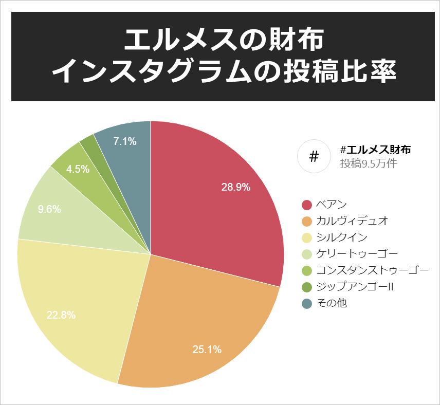 インスタグラムの「#エルメス財布」投稿の中から、女性が実際に使っている投稿、プレゼントされた投稿、自分へのご褒美で買った投稿、それらを集計し算出しました。