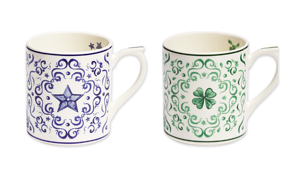 フランス語で「お守り」を意味する名を冠し、創業者クリスチャン・ディオールが大切にした幸運のシンボル(星、クローバー、蜂、ローズ)を優しい色彩で描いたマグカップ。