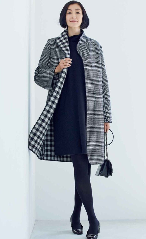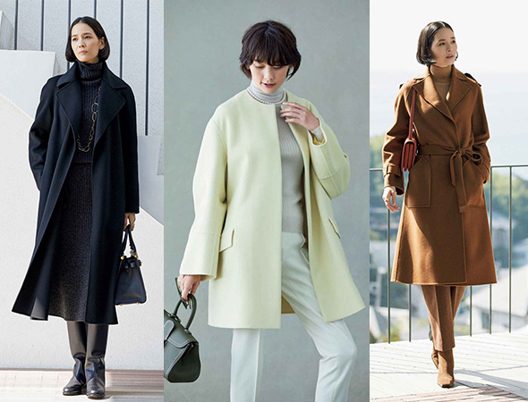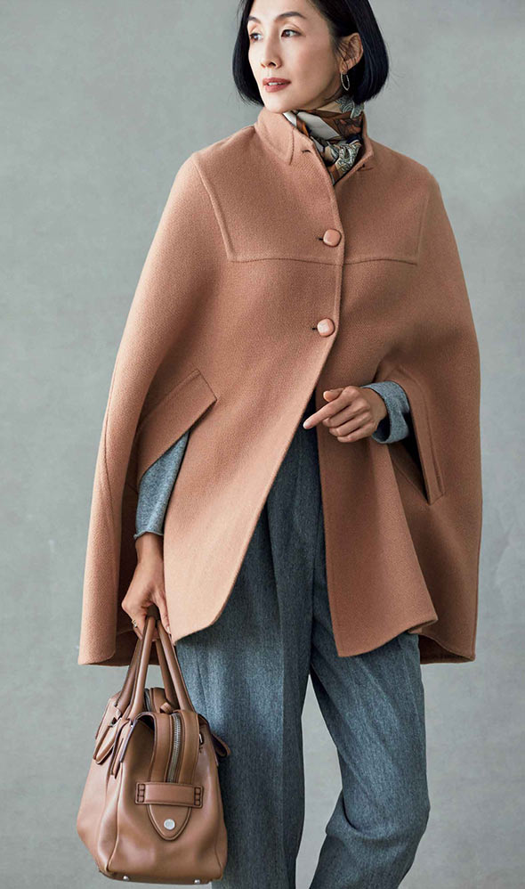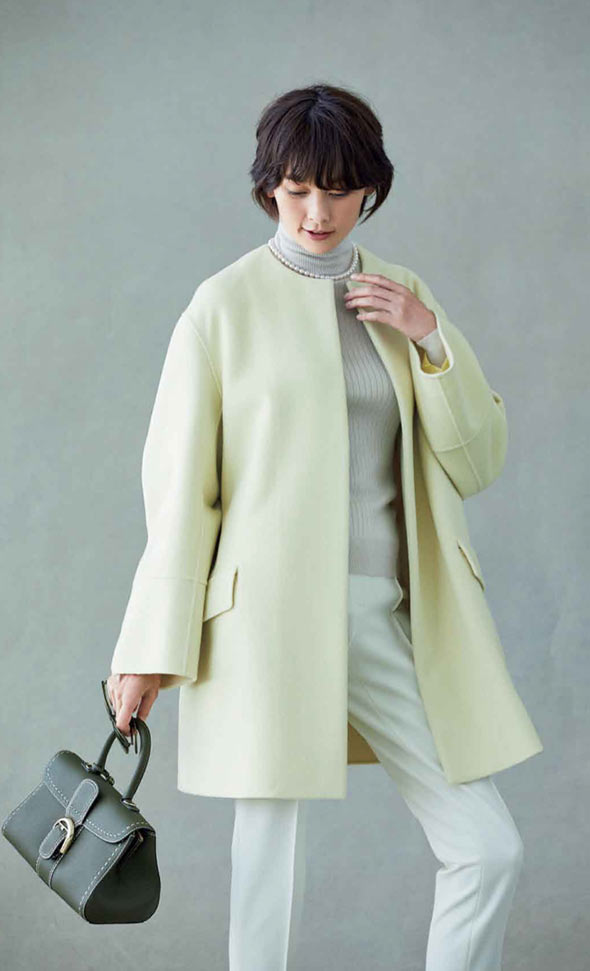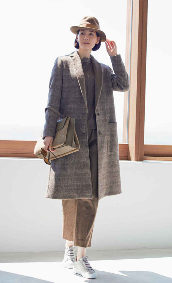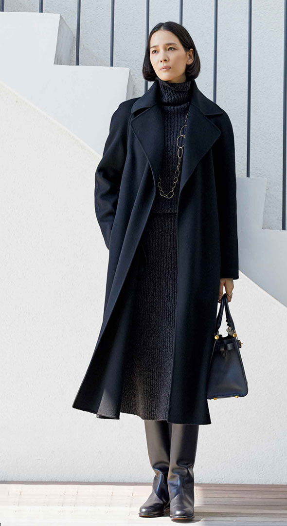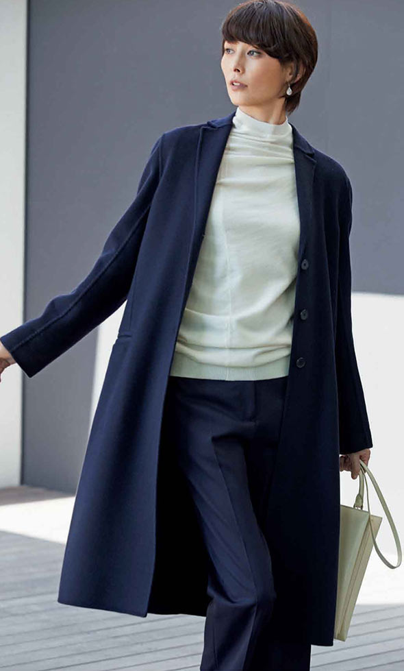 高級コートの魅力は、オーセンティックなアイテムだけあって、着こなしの幅がさまざまに広がるところ。カジュアルなパンツスタイルにも、フェミニンなワンピースにもぴったりです。
