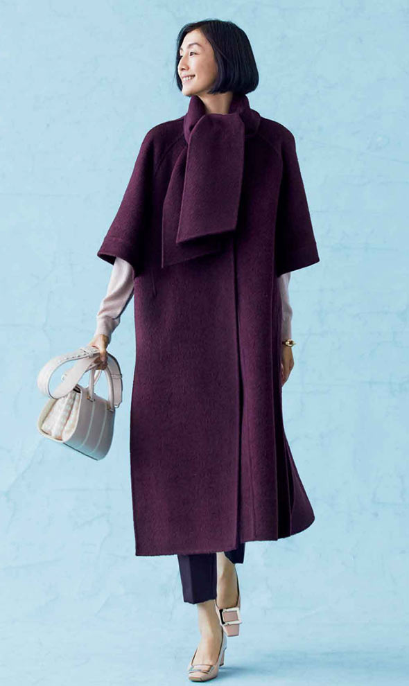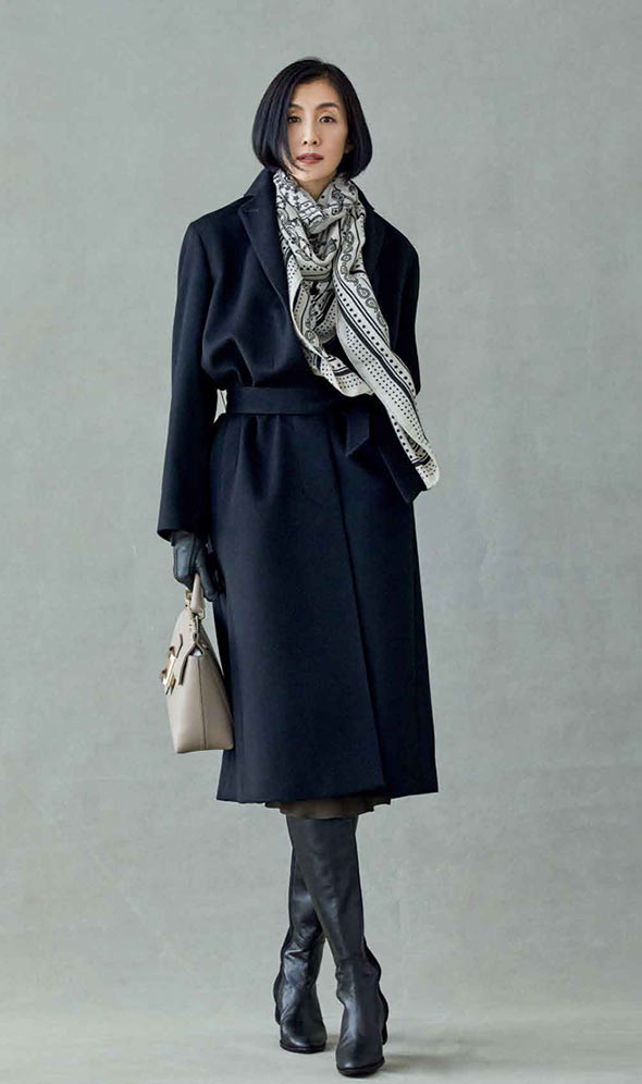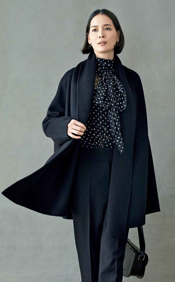 黒いカシミアのラップコートは冬の定番アイテム。ボリュームのある大判のストールを衿もとにあしらって、コートスタイルをスタイリッシュに演出します。