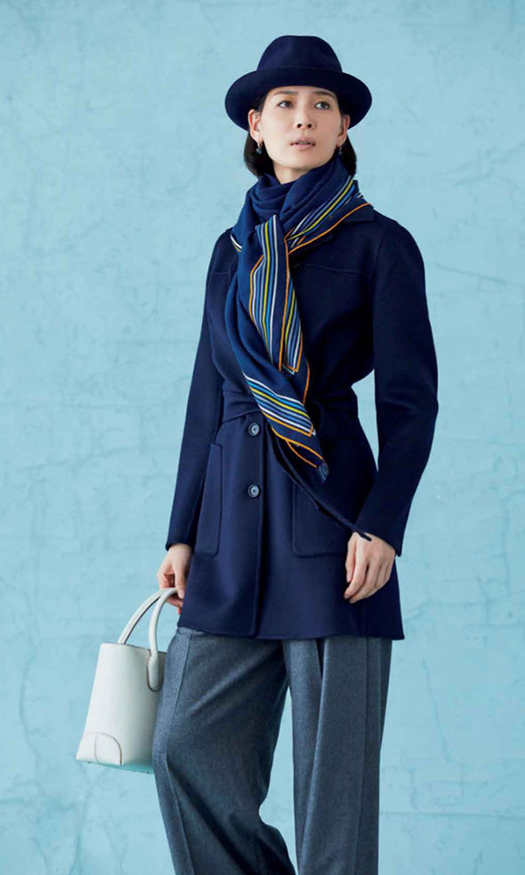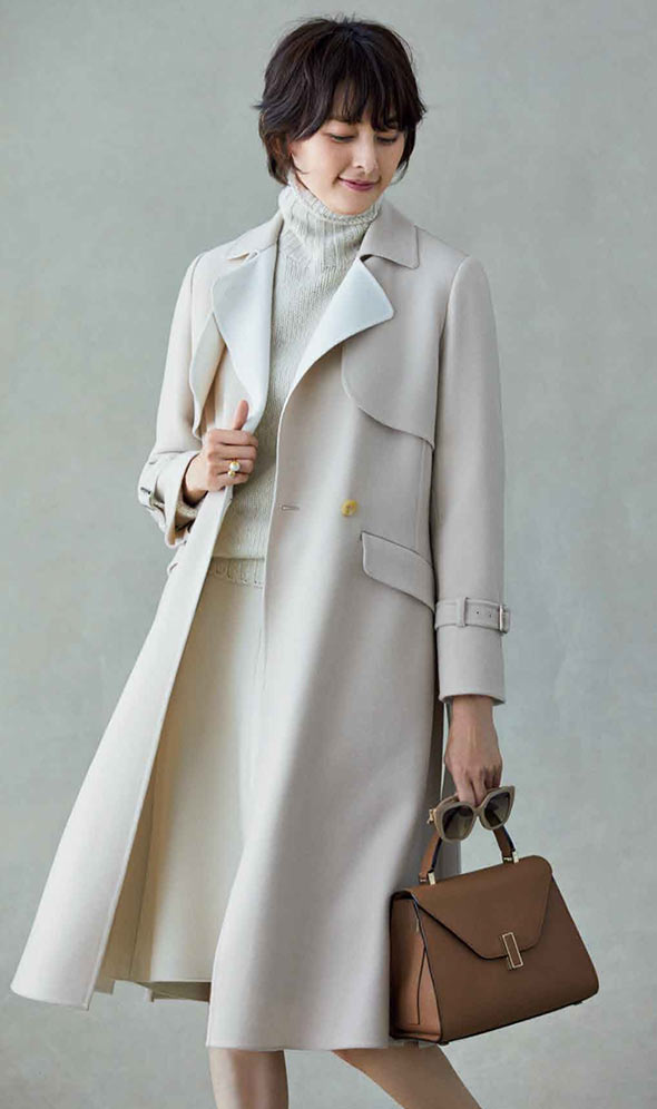冬のトレンチコートは、しなやかな素材を選びたいもの。品のよさを伴ったカシミアのダブルフェースで、優雅な雰囲気を楽しみます。