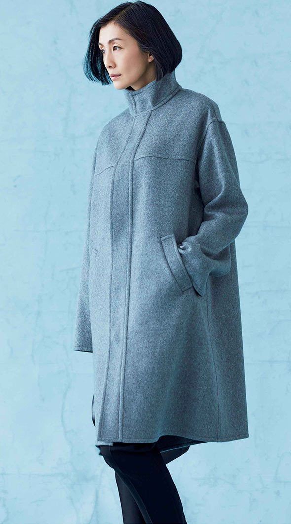 ダブルフェースのカシミアのコートは、最小限のディテールでデザインされたシンプルなもの。やや高めのスタンドカラーが、ボックスシルエットのコートをエレガントに見せています。着こなしの幅が広がるグレーはこの冬、クローゼットにそろえたい一着です。