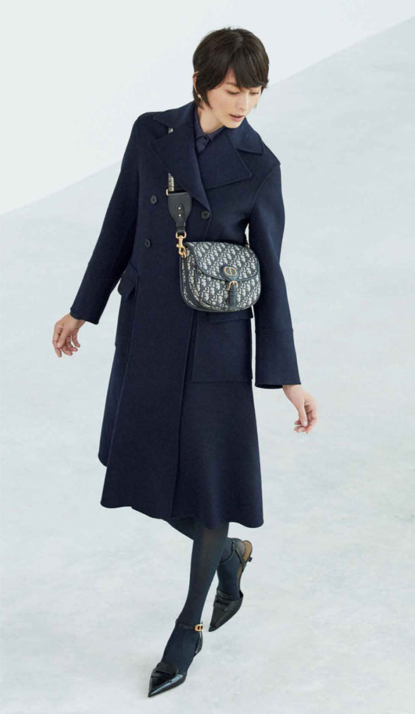 コート(550,000円)、ブラウス(参考価格220,000円)バッグ(370,000円)ストラップ(115,000円)、靴(114,000円)ディオール、ピアス(52,000円)ディオール ファインジュエリー