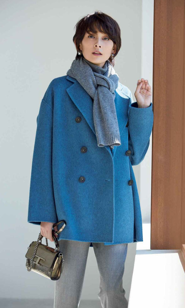 メルトン素材の本格的なタイプとは違うウールコットンのソフトなピーコート。袖つけがドロップショルダーになっていて、着心地も抜群です。爽やかなライトブルーで。