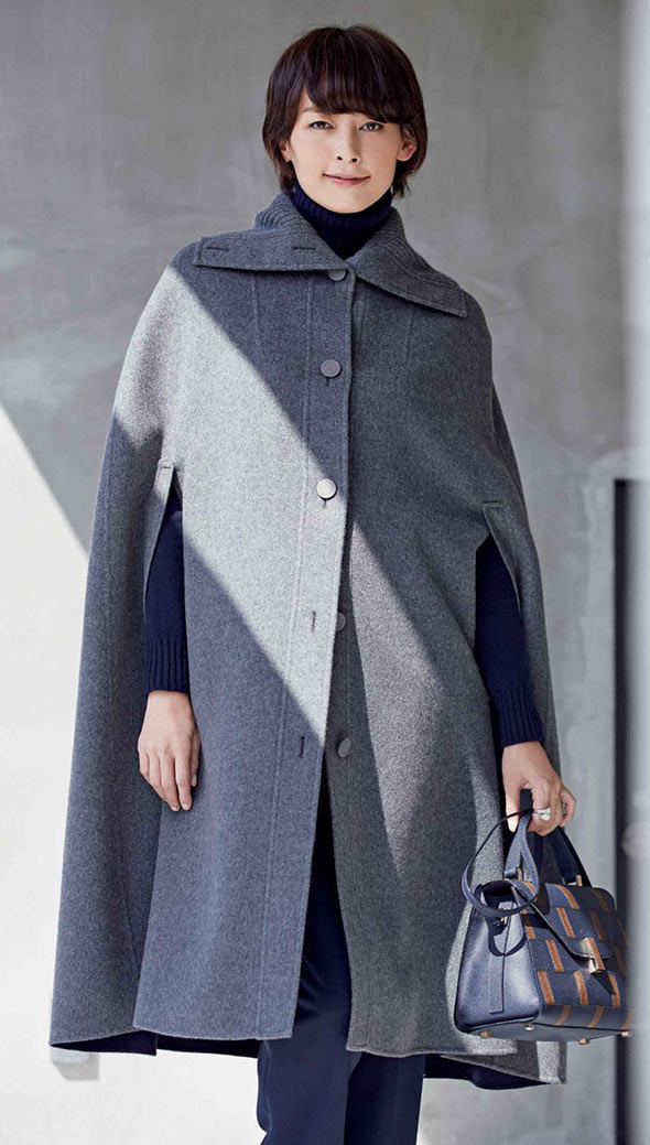 衿にリブ編みのニットをあしらったポンチョ風コート。ダブルフェースのカシミア素材で、レザーのボタンがポイントです。