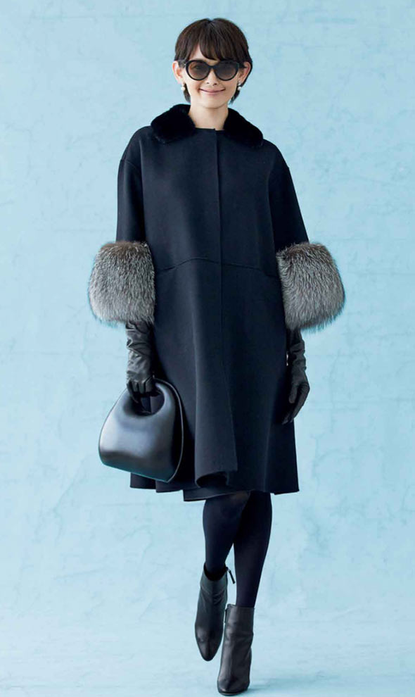 緩やかにウエストをシェープした女性らしいコートは、アストラカンのファーのような毛足が特徴的。すっきりとした印象に仕上げるために、ワンピースを一枚さらりと着るように、シンプルに着こなして。