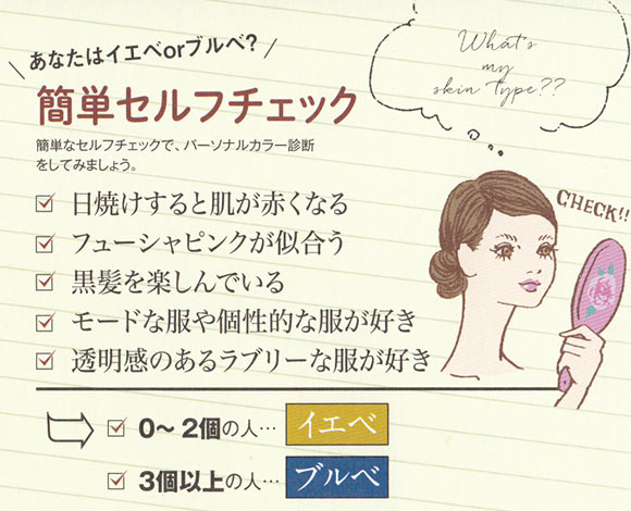 イエベはイエローベースの略、ブルベはブルーベースの略で、これはパーソナルカラー診断のひとつです。パーソナルカラーというのは、生まれ持った肌や髪、顔立ちなどに調和しやすい色のこと。そういわれると凝り固まってしまいがちですが、パーソナルカラーは、顔型や瞳の色などと同じひとつの条件にすぎません。あくまで似合う色を探すためのヒント!