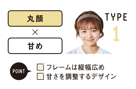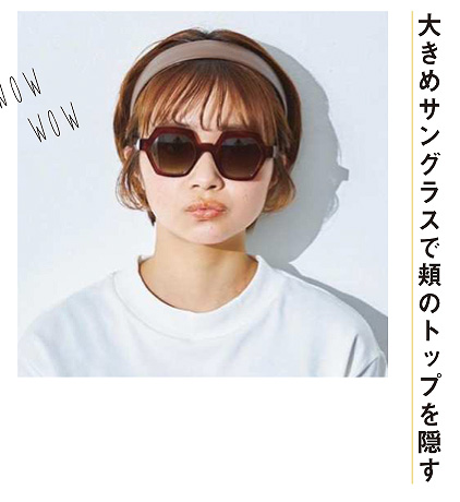 頬の高さが際立つとより顔がより丸く見えがち。頬のトップを隠しつつ、丸顔さんは幼く見えないよう、ほどよく引き締められるデザインを選んで。