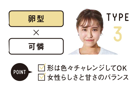 どんな型も似合いやすい卵型の輪郭。だからこそ、顔とのバランスを重視してみて。可憐な顔なら、顔立ちを生かしつつ甘すぎないさじ加減を意識。