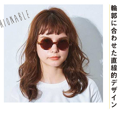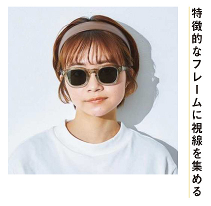 繊細な細工のフレームが光に反射し輝くので輪郭に視線が集中しません。ディティールがフェミニンなので薄めブラウンレンズで大人っぽさもオン。