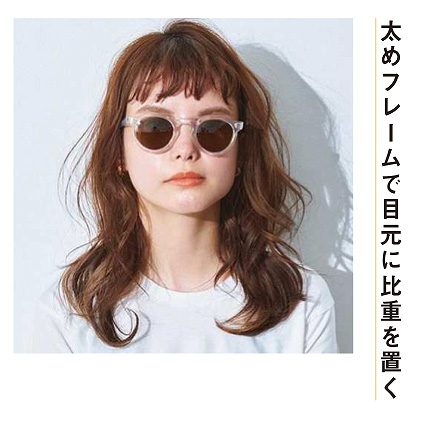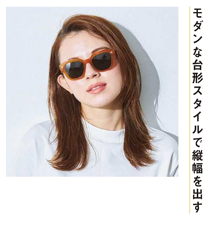 サングラスをつけた時に縦の長さを意識させないことがポイント。縦幅があるものだとバランス良し。オトナ顔を生かしたクールなデザインがおすすめ。