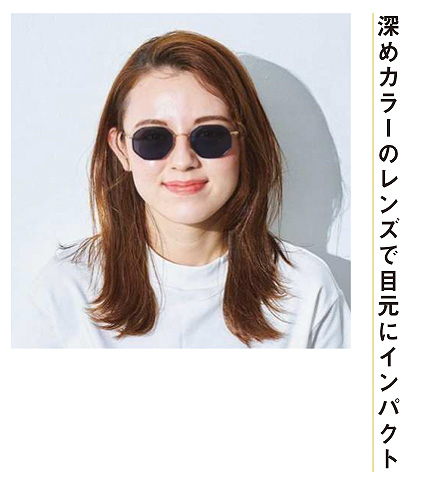華奢フレームのサングラスはレンズの色が深めのものを選ぶとインパクトUP。横長のオクタゴンデザインがエッジの効いた表情に仕上げてくれます。