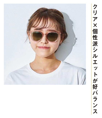 フランスの伝統的なクラウンパントゥ型もクリアフレームだとモダンな印象に。ややゴツめなデザインも輪郭にマッチ。