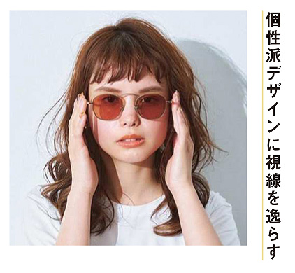 オクタゴンの個性的なアイテムもほどよく中和してくれる甘め顔さん。大きめレンズで顔の丸みが目立つ部分は隠してしまえばシャープな印象に!