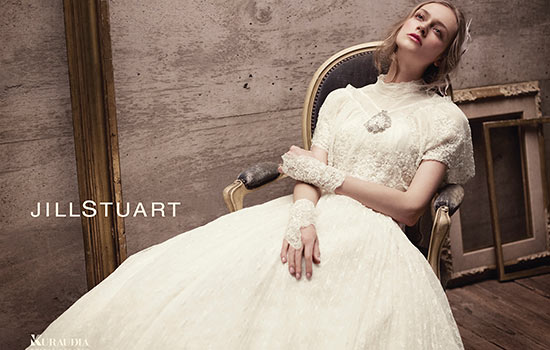 フロントもバックスタイルも大人フェミニンスイート♥ 女子力が上がる可愛いコスメでお馴染みの「ジルスチュアート」のウエディングライン。