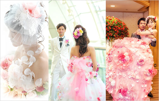 まるでお花畑のような一着を、たっぷりのフラワーアクセサリーで彩った、ブーケのように愛らしいロマンティックピンク。