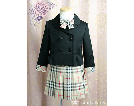 クラシカル&きちんと感のある4ボタンジャケットに、バーバリー柄スカートがオシャレに映えるフォーマル服。