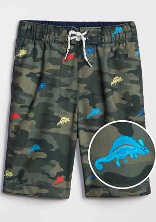 8.パッと見は迷彩だけど、じつは恐竜柄なんです!スイムショーツ(92~104cm) \1,990