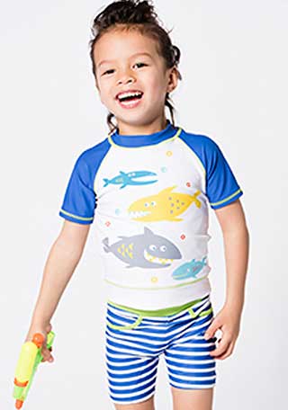 4.とぼけたサメの表情がお茶目♪サメ柄ラッシュガード&ショーツ(6M~5Y) \3,300