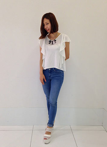 フリルの付いたノースリーブカットソーにジーンズを合わせたコーデ。
