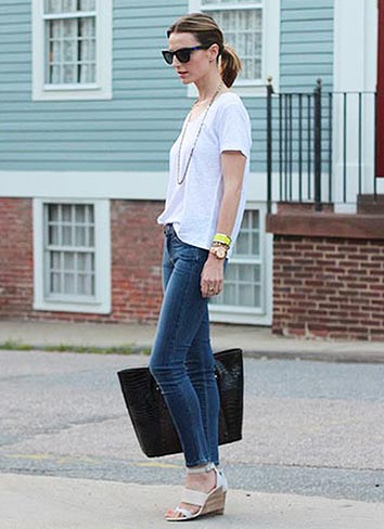 半袖の白カットソーにジーンズを合わせた、夏向けの きれいめコーデ。
