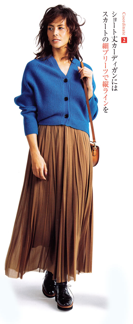 2.ふんわりしたシルエットのショート丈カーディガンは、プリーツスカートでフェミニンに。足もとは黒で引き締めて。