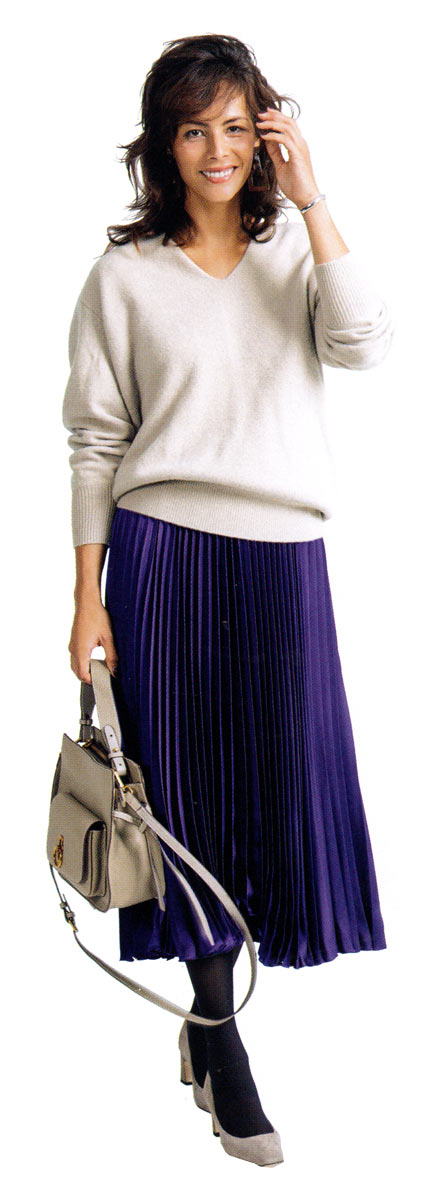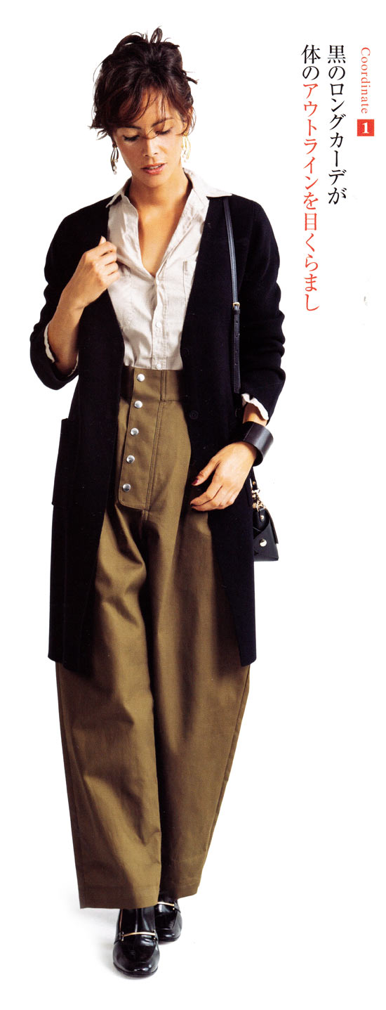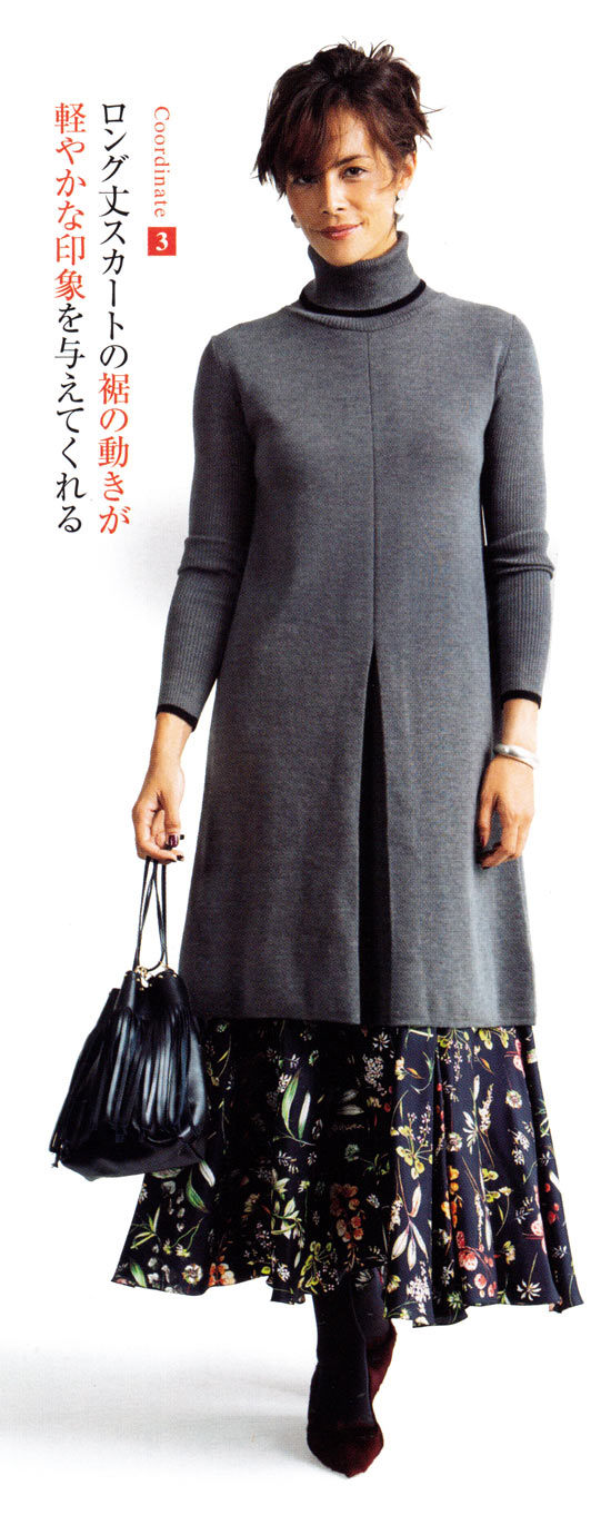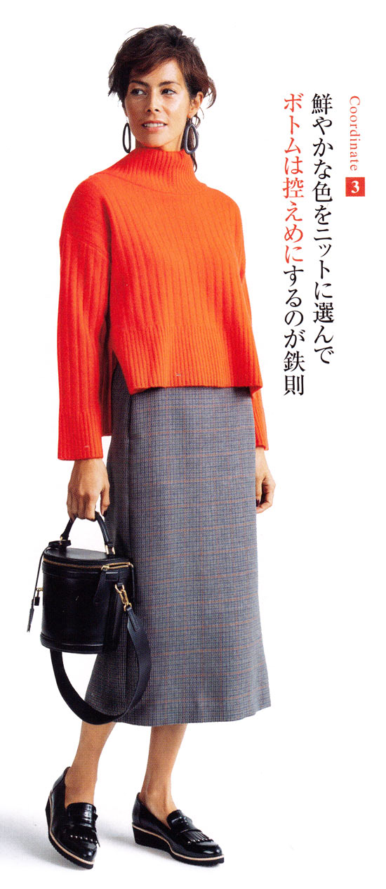 3.背低さんは視線を上に向けるのがポイントなので、鮮やかな色のニットは効果的。ボトムはシックな色にしてラインに仕上げて。