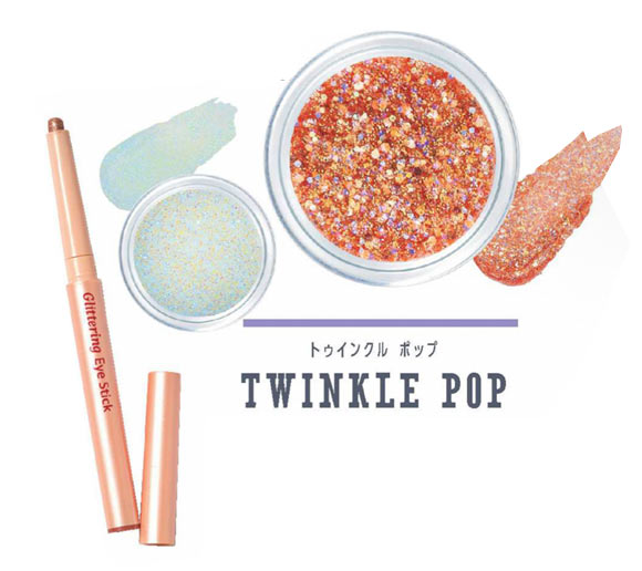 (右から) JELLY GLITTER #5 ¥1,970 / JE LLY GLITTER #1 ¥1,970 / Glittering Eye Stick #12 ¥828 / Flex Glitter Eye Palette Hey, Rose ¥1,180
