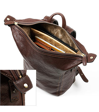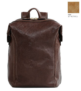 キメ細かいペブルドレザーを使った「ソフトな印象」のレザーリュック。耐久性も良く、便利な全面ポケットなど実用性にも優れています。