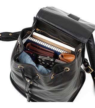 A5サイズ対応で、手帳や500mlペットボトルもしっかり入るリュック。金具が外側から見えないようにしているので上品さも◎です。