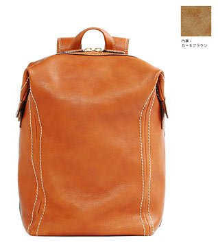 A4サイズの書類が楽に収まる、使いやすいサイズ感のレザーリュック。マチにも余裕があるので1泊~2泊くらいの荷物が入ります。素材は使うほどに自分だけの革になる「オイルヌメ革」。