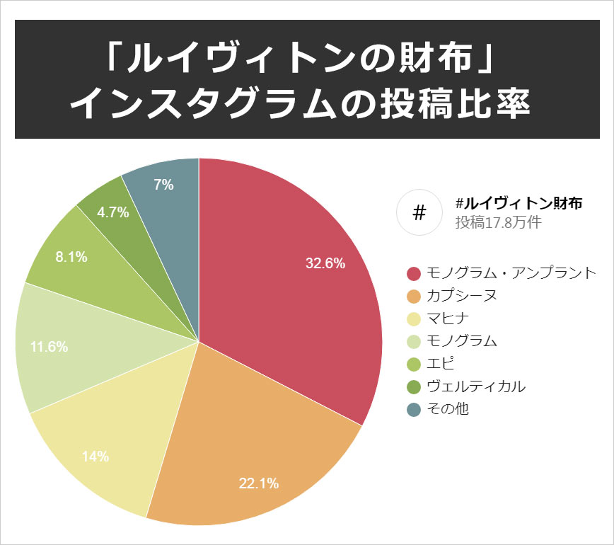 インスタグラムの「#ルイヴィトン財布」178,000投稿の中から、女性が実際に使っている投稿、プレゼントされた投稿、自分へのご褒美で買った投稿、それらを集計し算出しました。