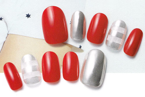 赤は、片手の爪の3本ずつに、ランダムに塗る。両方の薬指の爪にベースコートを塗り、乾いたら、5ミリ幅のマスキングテープを5ミリ間隔で貼る。赤を塗っていない爪と薬指の爪に、市販のミラーネイルパウダーをすり込む。上からトップコートを塗って完成。