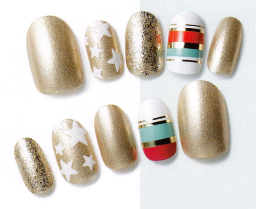 右手の薬指と左手の人差し指には、白、水色、ピンク、オレンジのボーダーを引き、その境目にゴールドのシールを貼る。その他の指にはゴールドのマニキュアを塗り、右手の中指と左手の小指に大きめのラメをちらす。右手の人差し指と左手の薬指に星のシールを散らせる。星の大きさと角度を変えるとオシャレ感が出ます。