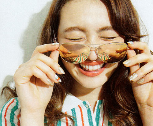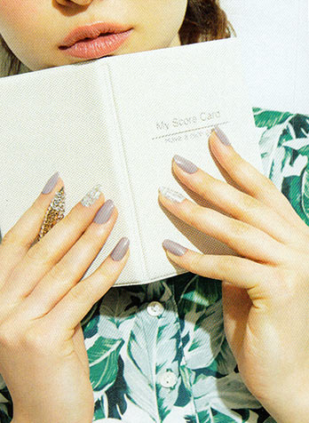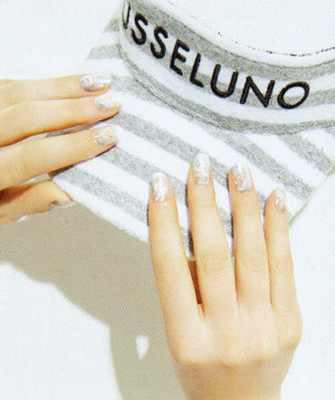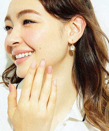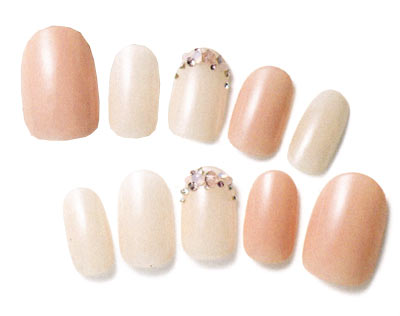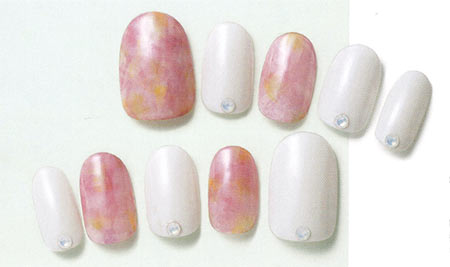 片手3本ずつにオフホワイトを塗り、爪の根元にグルーでラインストーンをつける。他の2本は、ベースに濃いピンクを塗り、乾いたら、薄いピンクや白のマニキュアを、まだらに重ねていく。ベースの濃いピンクが透けるくらい、刷毛を押しつけてシアーに色づけるのがポイント。乾いたら次の色を重ねる要領で。