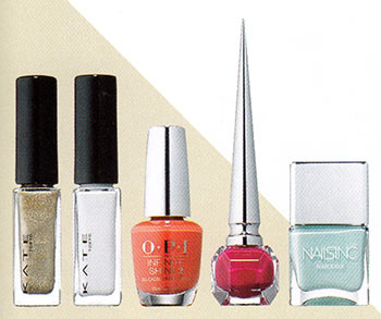 右から / 英国の伝統的なガーデンからインスパイア。ネイルズ インク ネイルケール ネイルポリッシュ ロイヤル クレセント ガーデンズ \2,600(ティーエーティー)大胆に弾けるフューシャが女子を虜に。ネイルカラー バンガリ \6,900(クリスチャンルブタン)太陽の下で大活躍のビタミンカラー。インフィニット シャイン リビング オン ザ ブラバード! \2,200(オーピーアイジャパン)ムラになりにくいなめらかな塗り心地。ケイト ネイルエナメルカラー WT-5 大小のパールで存在感を増す。同 GD-1各 \360(ともにカネボウ化粧品)