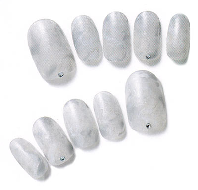 ベースにホワイトを塗り、乾かす。白とグレーの3色のマニキュアを多めに取り、ドットを描くように、爪にのせる。楊枝などでランダムに螺旋を描き、マーブル状に混ぜる。爪の根元に、ネイル用のグルーでラインストーンをポイントでつけて。