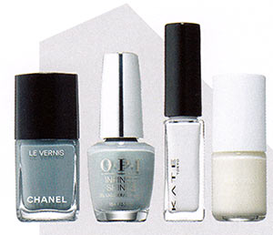 右から / ベースにもしやすい黄味がかったホワイト。shiro 亜麻ネイル 7B06 \2,400(ローレル)速乾性が抜群。ケイト ネイル エナメルカラー WT-5 \360(カネボウ化粧品)偏光グレーが大人のおしゃれを格上げ。インフィニット シャイン アイ キャンネバー ハット アップ \2,200(オーピーアイジャパン)くすんだブルーが手元を美しく見せる。ヴェルニ ロング トゥニュ 566 \3,200(シャネル)