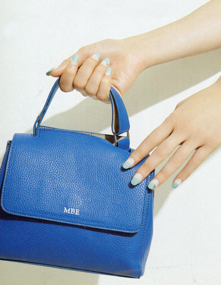 乳白色のベースコートを塗る。乾いたら、ブルーのマニキュアでバルーンフレンチを描く。刷毛を大きく広げるように押し付け、力を抜きながら引くと、きれいな円が作れます。両手の薬指の爪にパールをつけたら完成。